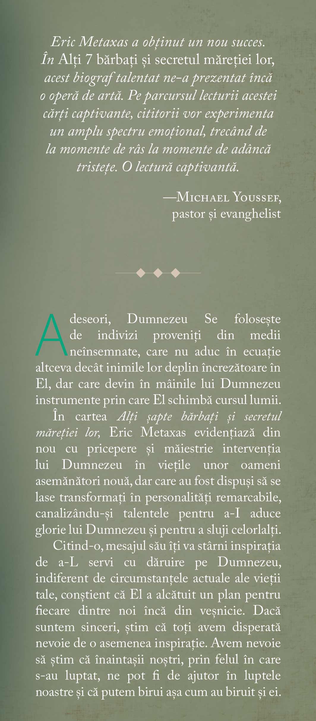 In cartea Alti sapte barbati si secretul maretiei lor, Eric Metaxas evidentiaza din nou cu pricepere si maiestrie interventia lui Dumnezeu in vietile unor oameni asemanatori noua, dar care au fost dispusi sa se lase transformati in personalitati remarcabile, canalizandu-si talentele pentru a-I aduce glorie lui Dumnezeu si pentru a sluji celorlalti.