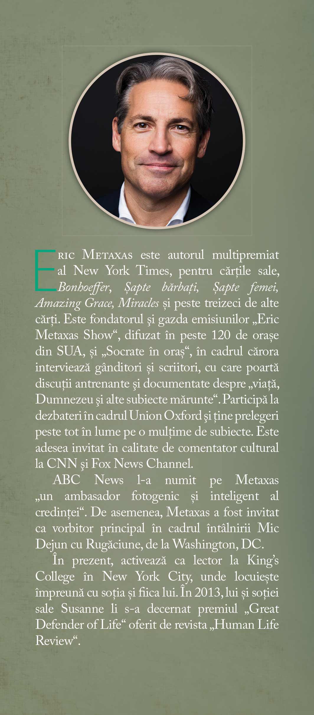 Eric Metaxas este autorul multipremiat al New York Times, pentru cartile sale Miracles, Bonhoeffer, Seven Men, Amazing Grace si peste treizeci de alte carti. El este gazda emisiunii Eric Metaxas Show, un program radio national care se difuzeaza in mai bine de 120 de orase din SUA. ABC News l-a numit pe Metaxas „un ambasador fotogenic si inteligent al credintei“. El a fost vorbitorul principal la Micul Dejun cu Rugaciune din 2012 in Washington, DC, si in fiecare an se adreseaza in conferinte si prelegeri la zeci de mii de ascultatori din Statele Unite si din strainatate. In prezent, activeaza ca lector la King’s College in New York City, unde traieste impreuna cu sotia si fiica lui.