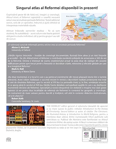 Singurul atlas al Reformei disponibil în prezent! Cuprinzând peste 60 de harti noi, imagini si cronologii, Atlasul istoric al Reformei reprezinta o unealta necesara oricui vrea sa studieze perioada Reformei. Textul aditional concis, scris de un specialist, îndruma si ajuta cititorul sa interpreteze materialele vizuale. Adresat îndeosebi oamenilor studiosi fie ca sunt studenti, fie autodidacti acest volum este foarte potrivit atât pentru studiu individual, cât si pentru grupuri sau sali de cursuri.