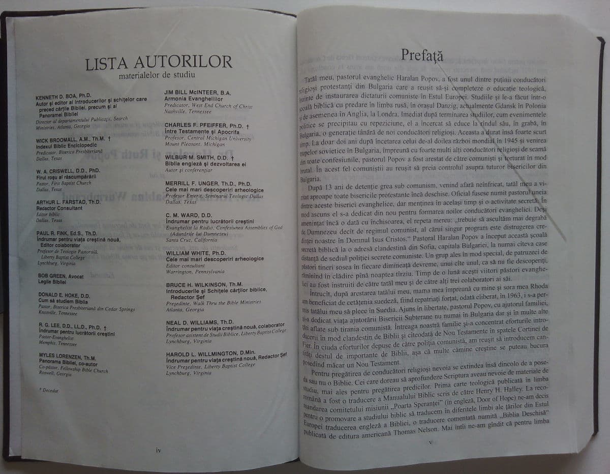 La inceputul anilor 80, regretatul Haralan Popov, fondatorul editurii sub a carei egida apare Biblia de studiu in limba romana, punea bazele traducerii si tiparirii acestei lucrari enciclopedice. Initial s-a preconizat incorporarea textului actual al editiei Cornilescu in formatul lucrarii The Open Bible, pentru a putea fi folosit ca baza pentru cele citeva sute de pagini de material de studiu, urmind sa se faca foarte putine modificari, in cea mai mare parte doar o aducere la zi a ortografiei. Dar de indata ce a inceput culesul ei la tipar, s-a primit la redactie un numar mare de sugestii pentru imbunatatirea textului celei mai raspindite editii aflate in uz la ora actuala in Romania.