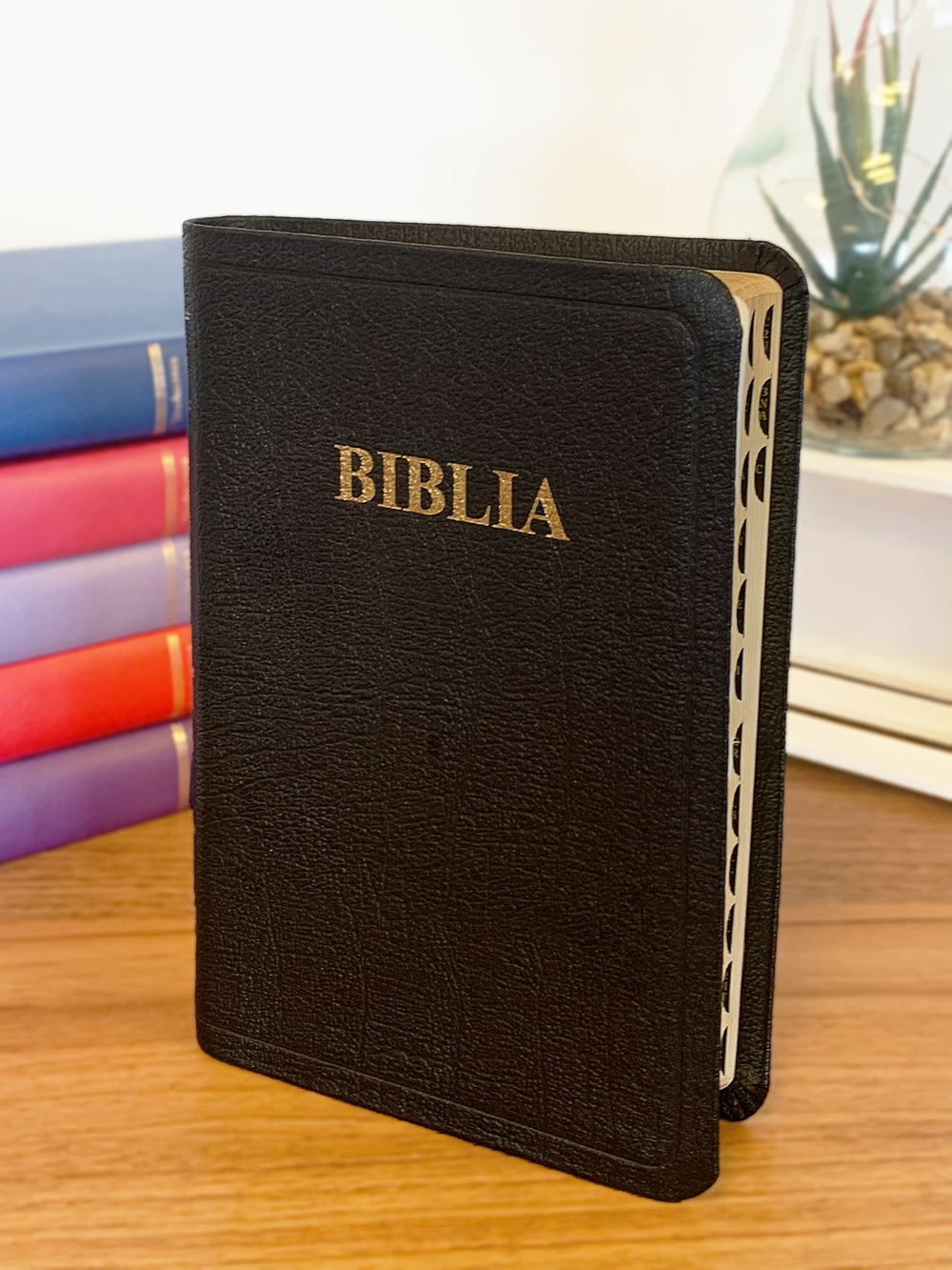 Biblie format mediu, copertă în piele fără fermoar, cu margini aurii și index.