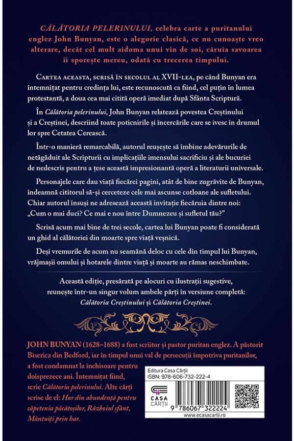 Această ediție, presărată pe alocuri cu ilustrații sugestive, reunește într-un singur volum ambele părți în versiune completă: Călătoria Creștinului și Călătoria Creștinei.