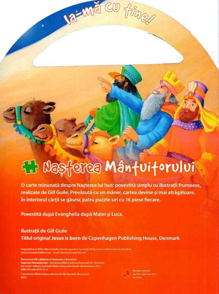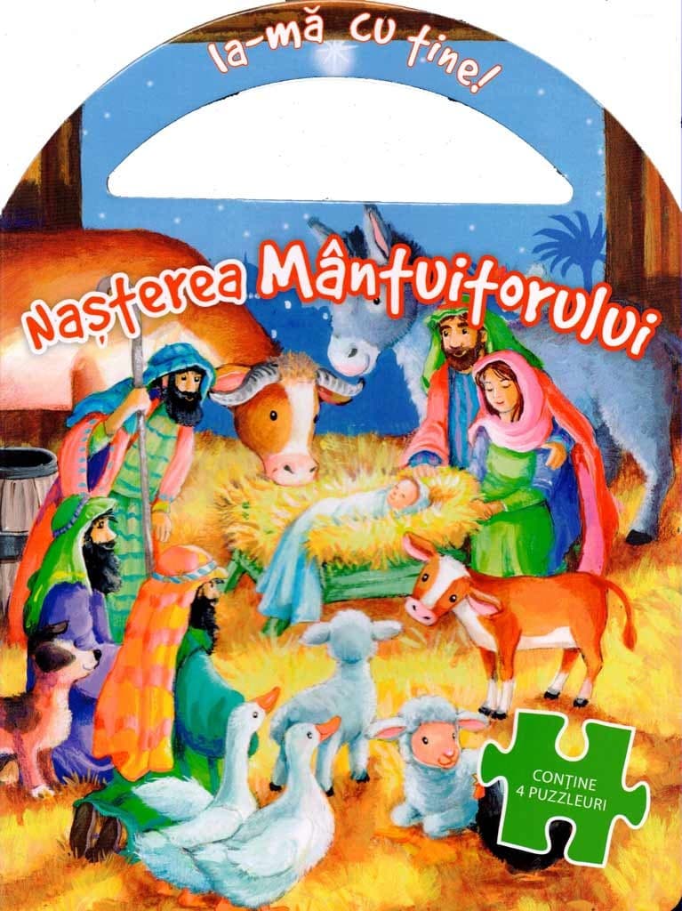 O carte minunata despre Nasterea Mantuitorului: povestita simplu cu ilustratii frumoase, realizate de Gill Guille. Prevazuta cu un maner, cartea devine si mai atragatoare. In interiorul cartii se gasesc 4 puzzle-uri cu 16 piese fiecare.