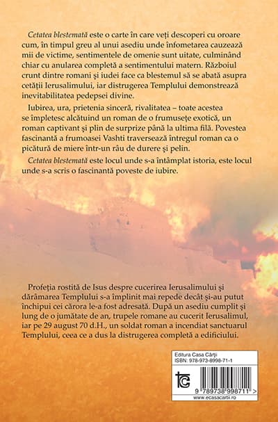 Cetatea blestemata este o carte în care veti descoperi cu oroare cum, în timpul greu al unui asediu unde înfometarea cauzeaza mii de victime, sentimentele de omenie sunt uitate, culminând chiar cu anularea completa a sentimentului matern. Razboiul crunt dintre romani si iudei face ca blestemul sa se abata asupra cetatii Ierusalimului, iar distrugerea Templului demonstreaza inevitabilitatea pedepsei divine. Iubirea, ura, prietenia sincera, rivalitatea toate acestea se împletesc alcatuind un roman de o frumusete exotica, un roman captivant si plin de surprize pâna la ultima fila. Povestea fascinanta a frumoasei Vashti parcurge întregul roman ca o picatura de miere într-un râu de durere si pelin. Cetatea blestemata este locul unde s-a întâmplat istoria, este locul unde s-a scris o fascinanta poveste de iubire. Profetia rostita de Isus despre cucerirea Ierusalimului si darâmarea Templului s-a împlinit mai repede decât si-au putut închipui cei carora le-a fost adresata. Dupa un asediu cumplit si lung de o jumatate de an, trupele romane au cucerit Ierusalimul, iar pe 29 august 70 d.H., un soldat roman a incendiat sanctuarul Templului, ceea ce a dus la distrugerea completa a edificiului. Cetatea a fost distrusa din temelie, iar printre obiectele luate de Titus ca prada de razboi si duse la Roma s-a numarat si menora sau sfesnicul cu sapte brate.
