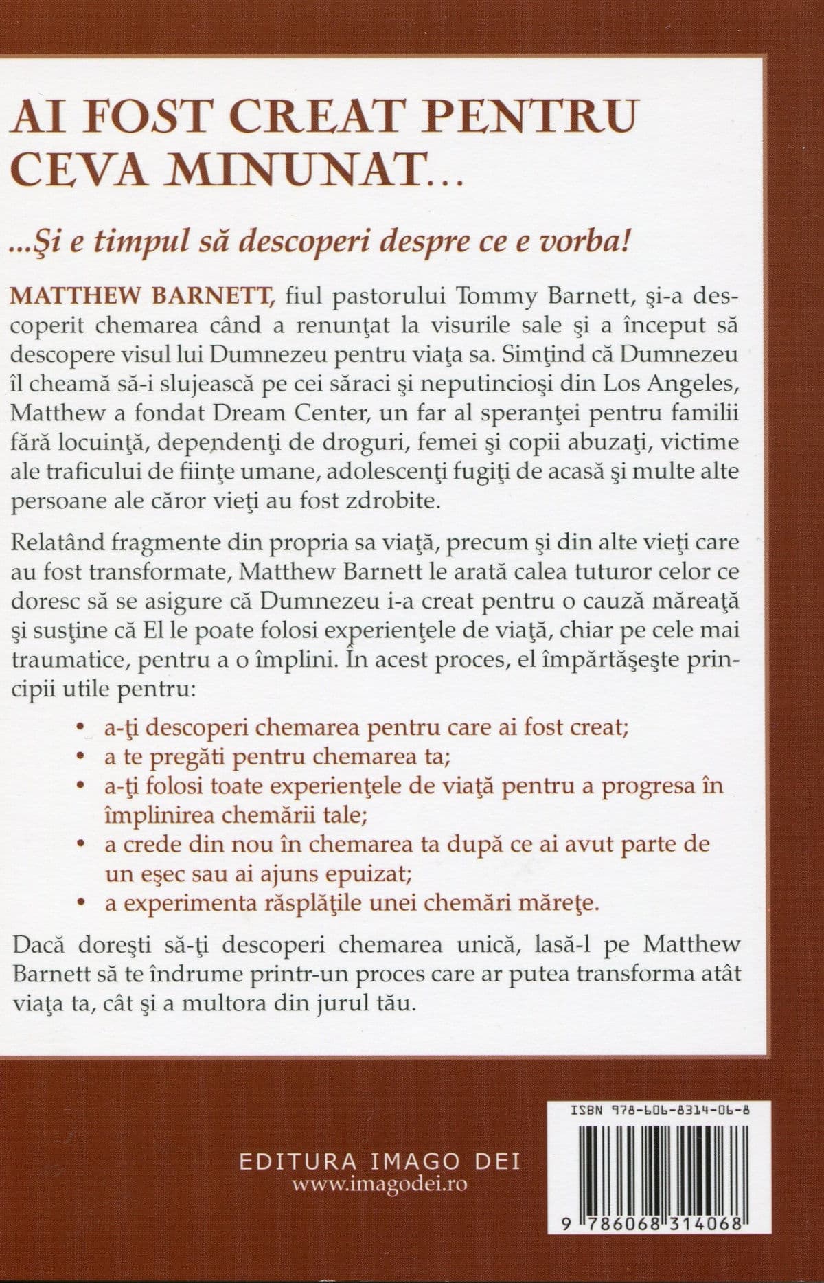 Relatând fragmente din propria sa viaţă, precum şi din alte vieţi care au fost transformate, Matthew Barnett le arată calea tuturor celor ce doresc să se asigure că Dumnezeu i-a creat pentru o cauză măreaţă şi susţine că El le poate folosi experienţele de viaţă, chiar pe cele mai traumatice, pentru a o împlini. În acest proces, el împărtăşeşte principii utile pentru:
