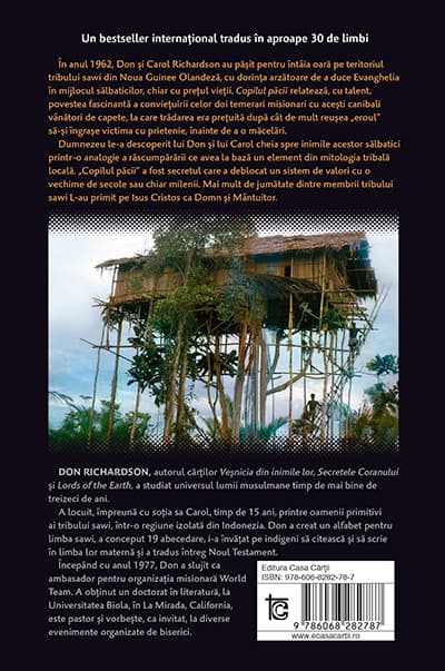 În anul 1962, Don si Carol Richardson au pasit pentru întâia oara pe teritoriul tribului sawi din Noua Guinee Olandeza, cu dorinta arzatoare de a duce Evanghelia în mijlocul salbaticilor, chiar cu pretul vietii. Copilul pacii relateaza, cu talent, povestea fascinanta a convietuirii celor doi temerari misionari cu acesti canibali vânatori de capete, la care tradarea era pretuita dupa cât de mult reusea eroul sa-si îngrase victima cu prietenie, înainte de a o macelari. Dumnezeu le-a descoperit lui Don si lui Carol cheia spre inimile acestor salbatici printr-o analogie a rascumpararii ce avea la baza un element din mitologia tribala locala. Copilul pacii a fost secretul care a deblocat un sistem de valori cu o vechime de secole sau chiar milenii. Mai mult de jumatate dintre membrii tribului sawi L-au primit pe Isus Cristos ca Domn si Mântuitor. Aceasta carte, dimpreuna cu lectiile de viata pe care le contine, va fi de mare folos generatiei contemporane care înca are misiunea de a raspândi mai departe Evanghelia lui Cristos.