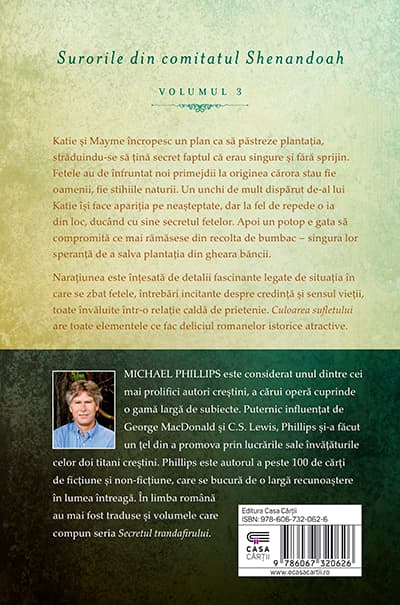 Katie şi Mayme încropesc un plan ca să păstreze plantaţia, străduindu-se să țină secret faptul că erau singure şi fără sprijin. Fetele au de înfruntat noi primejdii la originea cărora stau fie oamenii, fie stihiile naturii. Un unchi de mult dispărut de-al lui Katie îşi face apariţia pe neașteptate, dar la fel de repede o ia din loc, ducând cu sine secretul fetelor. Apoi un potop e gata să compromită ce mai rămăsese din recolta de bumbac – singura lor speranţă de a salva plantaţia din gheara băncii. Naraţiunea este înţesată de detalii fascinante legate de situaţia în care se zbat fetele, întrebări incitante despre credinţă şi sensul vieţii, toate învăluite într-o relaţie caldă de prietenie. Culoarea sufletului are toate elementele ce fac deliciul romanelor istorice atractive.