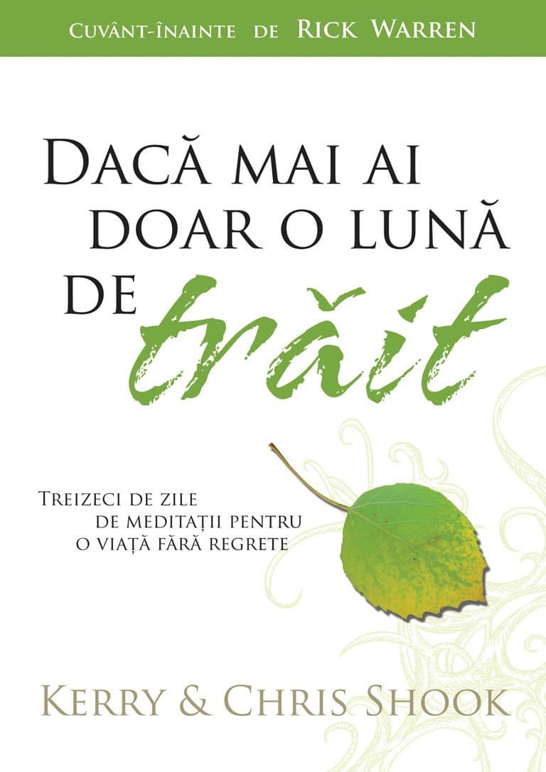 Iti sugerez sa-ti privesti situatia dintr-o perspectiva mai aparte, gandindu-te ca ai mai avea doar treizeci de zile de trait. Dupa socul initial cauzat de primirea vestii, probabil ca te-ai hotari sa folosesti la maximum zilele care ti-au mai ramas. Ai spune ceea ce gandesti cu adevarat. Ai iubi din toata inima. Te-ai concentra asupra celor mai importante lucruri pentru tine. Pe scurt, ai inceta sa mai irosesti timp pretios si, in timpul ce ti-a mai ramas, te-ai dedica formarii acelei persoane pe care a intentionat Dumnezeu sa o intruchipezi.