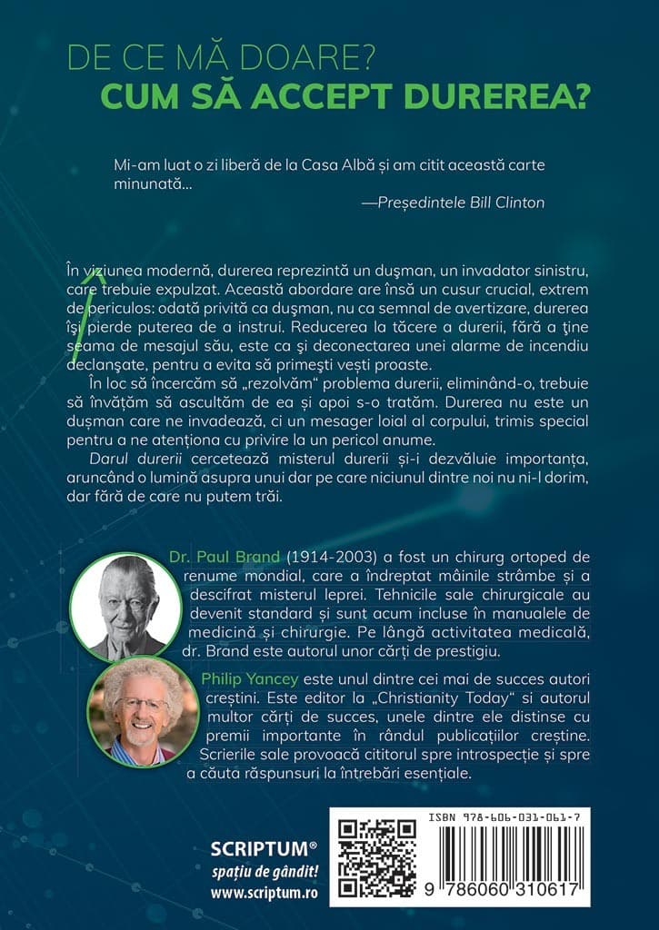 Darul durerii cerceteaza misterul durerii si-i dezvaluie importanta, aruncand o lumina asupra unui dar pe care niciunul dintre noi nu ni-l dorim, dar fara de care nu putem trai.