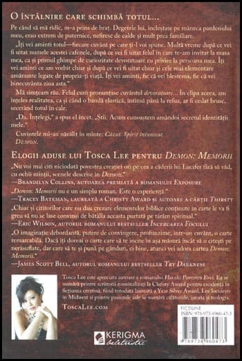 In clipa aceea, am inteles realitatea, ca si cand o banda elastica, intinsa pana la refuz, ar fi cedat brusc, secerand totul in cale. ‘Da. Intelegi, a spus el incet. ‘Stii. Acum cunoastem amandoi secretul identitatii mele. Cuvintele mi-au navalit in minte: Cazut. Spirit intunecat. Demon. Elogii aduse lui Tosca Lee pentru ‘Demon: Memorii’ ‘Nu voi mai citi niciodata povestea creatiei ori pe cea a caderii lui Lucifer fara sa vad, cu ochii mintii, scenele descrise in ‘Demon’. — Brandilyn Collins, autoarea premiata a romanului ‘Exposure’