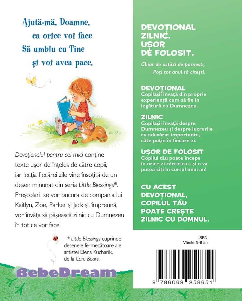 Devotionalul pentru cei mici contine texte usor de inteles de catre copii, iar lectia fiecarei zile vine insotita de un desen minunat din seria Little Blessings*. Prescolarii se vor bucura de compania lui Kaitlyn, Zoe, Parker si Jack – si impreuna vor invata sa paseasca zilnic cu Dumnezeu in tot ce vor face!