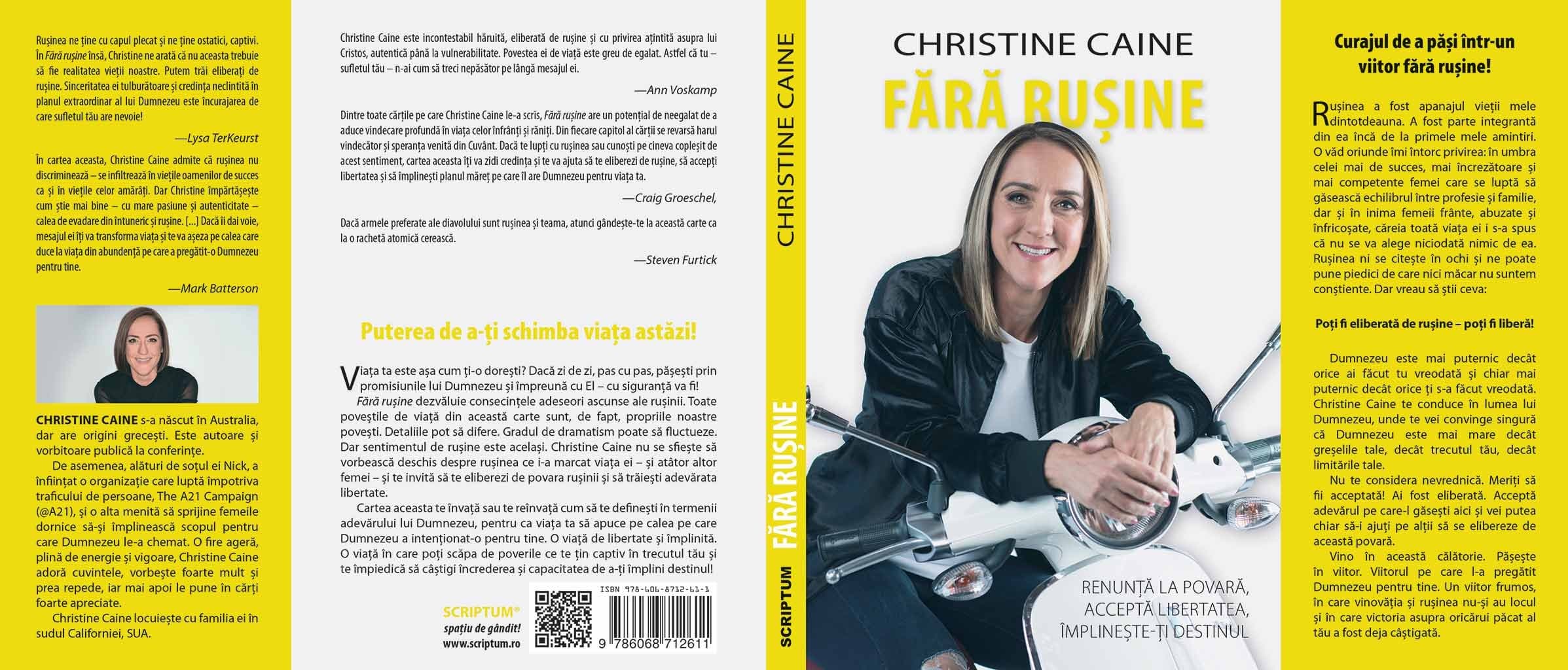 Dintre toate cartile pe care Christine Caine le-a scris, Fara rusine are un potential de neegalat de a aduce vindecare profunda in viata celor infranti si raniti. Din fiecare capitol al cartii se revarsa harul vindecator si speranta venita din Cuvant. Daca te lupti cu rusinea sau cunosti pe cineva coplesit de acest sentiment, cartea aceasta iti va zidi credinta si te va ajuta sa te eliberezi de rusine, sa accepti libertatea si sa implinesti planul maret pe care il are Dumnezeu pentru viata ta.