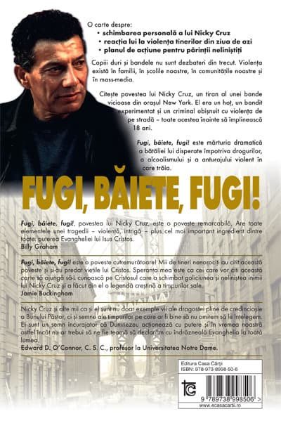 Fugi, băiete, fugi! este o poveste cutremurătoare! Mii de tineri au citit această poveste şi şi-au predat vieţile lui Cristos. Dorinţa mea este ca cei care vor citi această carte să ajungă să-L cunoască pe Cristosul care a schimbat goliciunea şi neliniştea inimii lui Nicky Cruz şi a făcut din el o legendă creştină a timpurilor sale.