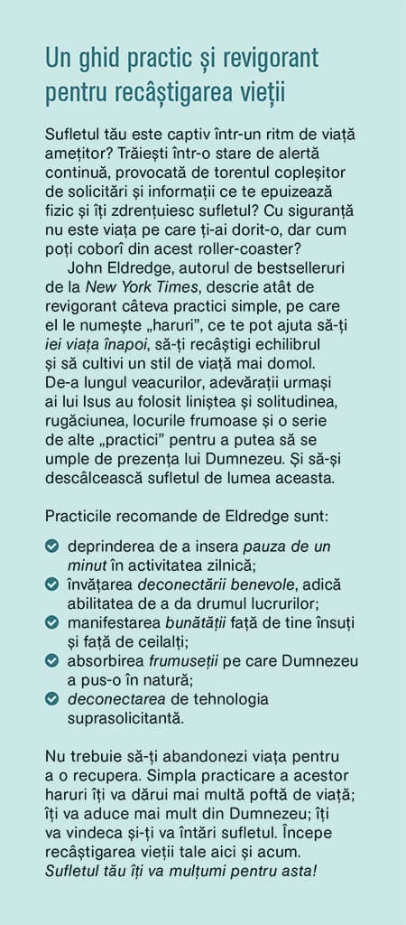 John Eldredge, autorul de bestselleruri de la New York Times, descrie atat de revigorant cateva practici simple, pe care el le numeste „haruri”, ce te pot ajuta sa-ti iei viata inapoi, sa-ti recastigi echilibrul si sa cultivi un stil de viata mai domol. De-a lungul veacurilor, adevaratii urmasi ai lui Isus au folosit linistea si solitudinea, rugaciunea, locurile frumoase si o serie de alte „practici” pentru a putea sa se umple de prezenta lui Dumnezeu. Si sa-si descalceasca sufletul de lumea aceasta.