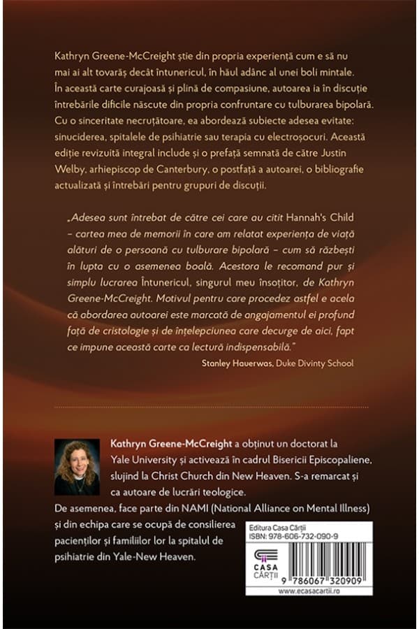 Adesea sunt intrebat de catre cei care au citit Hanna’s Child – cartea mea de memorii în care am relatat experienta de viata alaturi de o persoana cu tulburare bipolara – cum sa razbesti in lupta cu o asemenea boala. Acestora le recomand pur și simplu lucrarea Intunericul – singurul meu insotitor, de Kathryn Greene-McCreight. Motivul pentru care procedez astfel e acela ca abordarea autoarei este marcata de angajamentul ei profund fata de cristologie si de intelepciunea care decurge de aici, fapt ce impune această carte ca lectura indispensabila.