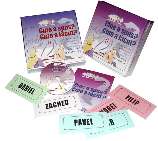•4 seturi a câte 32 de cartonaşe de culori diferite, conţinând numele celor mai importante personaje din Vechiul, respectiv Noul Testament