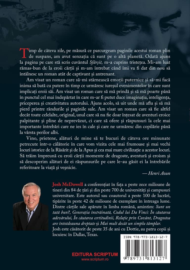 Vino, prietene, alaturi de mine sa te bucuri de cateva ore minunate petrecute intr-o calatorie in care vom vizita cele mai frumoase si mai vechi locuri istorice de la Rasarit si de la Apus si cea mai mare civilizatie a cestor locuri. Sa traim impreuna cu eroii cartii momente de dragoste, aventura si eroism si sa descoperim alaturi de ei raspunsurile pe care le-au gasit ei la intrebarile referitoare la viata si vesnicie.’