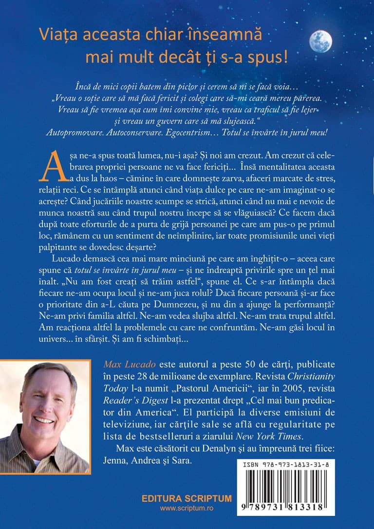 Lucado demasca cea mai mare minciuna pe care am inghitit-o: aceea care spune ca ‘totul se invarte in jurul meu’ si ne indreapta privirile spre un tel mai inalt. ‘Nu am fost creati sa traim astfel’, spune el. Ce s-ar intampla daca fiecare ne-am ocupa locul si ne-am juca rolul? Daca fiecare persoana si-ar face o prioritate din a-L cauta pe Dumnezeu, si nu din a ajunge la performanta? Ne-am privi familia altfel. Ne-am vedea slujba altfel. Ne-am trata trupul altfel. Am reactiona altfel la problemele cu care ne confruntam. Ne-am gasi locul in univers… in sfarsit. Si am fi schimbati…