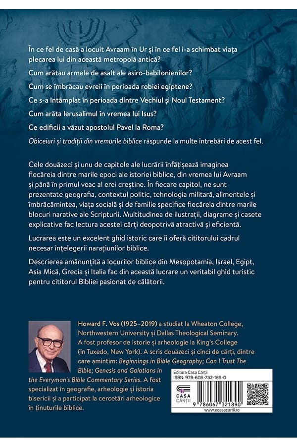 Howard F. Vos (1925-2019) a studiat la Wheaton College, Northwestern University și Dallas Theological Seminary. A fost profesor de istorie și arheologie la King’s College (în Tuxedo, New York). A scris 25 de cărți, dintre care amintim: Beginnings in Bible Geography; Can I Trust The Bible; Genesis and Galatians in the Everyman’s Bible Commentary Series. A fost specializat în geografie, arheologie și istoria bisericii și a participat la cercetări arheologice în ținuturile biblice.