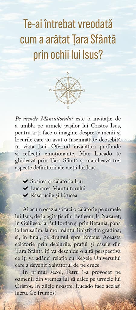 Fiecare metru patrat pare sa aiba un mesaj de transmis. Iar pe paginile acestei carti, Max Lucado doreste sa reinvie mesajele acelea in viata ta. Aceasta lume franta are disperata nevoie de un Mantuitor. Si ce har sa avem Unul. Putem sa umblam pe unde a umblat El si sa cugetam la promisiunile pe care le-a facut. Nu trebuie decat sa-L auzi cand iti vorbeste si sa lasi ca aceasta calatorie pe urmele Mantuitorului sa te transforme!