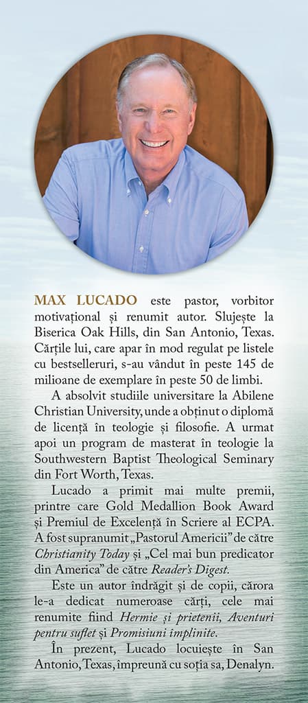 Max Lucado este pastor, vorbitor motivational si renumit autor. Slujeste la Biserica Oak Hills, din San Antonio, Texas. Cartile lui, care apar in mod regulat pe listele cu bestselleruri, s-au vandut in peste 145 de milioane de exemplare in peste 50 de limbi.