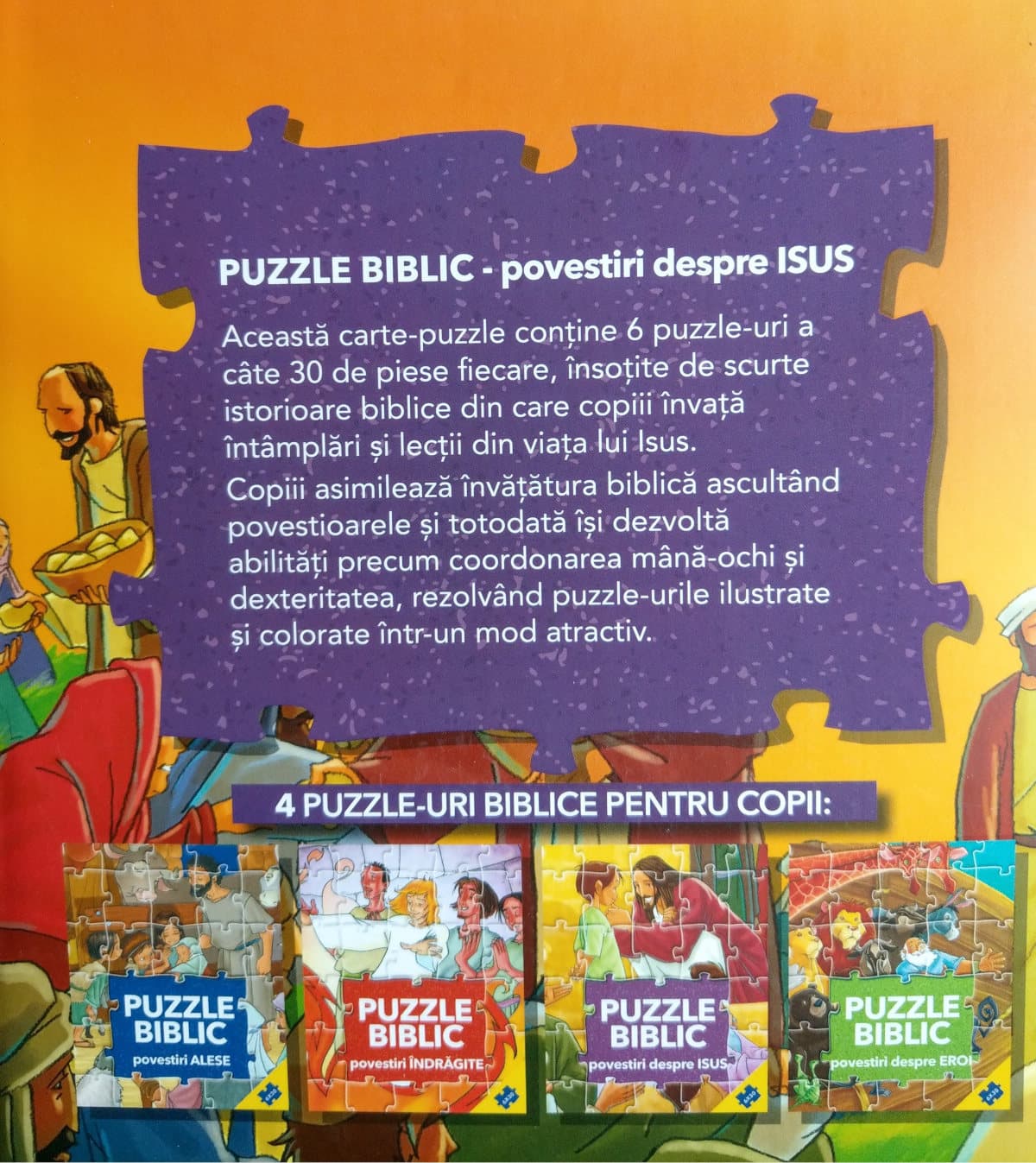 Aceasta carte-puzzle contine 6 puzzle-uri a cate 30 de piese fiecare, insotite de scurte istorioare despre intamplari biblice alese si indragite.