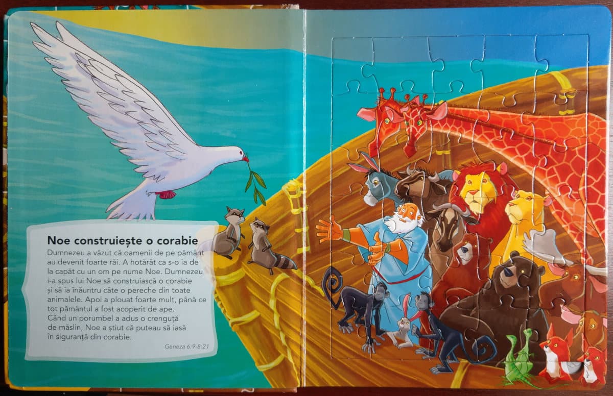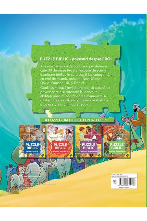 Aceasta carte-puzzle contine 6 puzzle-uri a cate 30 de piese fiecare, insotite de scurte istorioare biblice in care copiii fac cunostinta cu eroi de seama, precum: Noe, Moise, David, Samson, Ilie si Daniel.