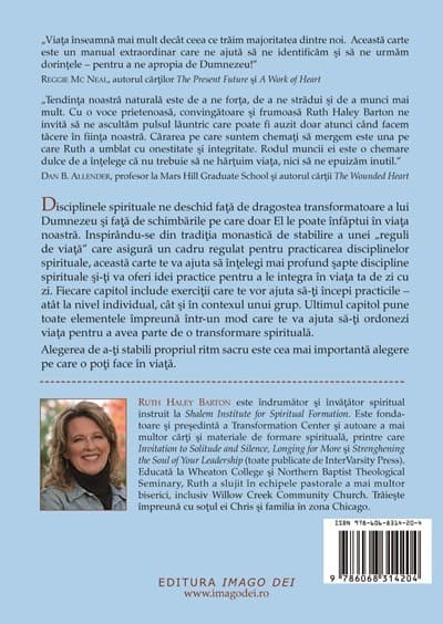 de viata” care asigura un cadru regulat pentru practicarea disciplinelor spirituale, aceasta carte te va ajuta sa intelegi mai profund sapte discipline spirituale si-ti va oferi idei practice pentru a le integra in viata ta de zi cu zi. Fiecare capitol include exercitii care te vor ajuta sa-ti incepi practicile – atat la nivel individual, cat si in contexul unui grup. Ultimul capitol pune toate elementele impreuna intr-un mod care te va ajuta sa-ti ordonezi viata pentru a avea parte de o transformare spirituala.
