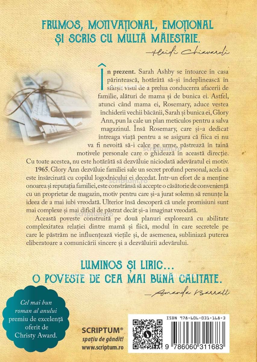 In prezent. Sarah Ashby se intoarce in casa parinteasca, hotarata sa-si indeplineasca in sfarsit visul de a prelua conducerea afacerii de familie, alaturi de mama si de bunica ei. Astfel, atunci cand mama ei, Rosemary, aduce vestea inchiderii vechii bacanii, Sarah si bunica ei, Glory Ann, pun la cale un plan meticulos pentru a salva magazinul. Insa Rosemary, care si-a dedicat intreaga viata pentru a se asigura ca fiica ei nu va fi nevoita sa-i calce pe urme, pastreaza in taina motivele personale care o ghideaza in aceasta directie. Cu toate acestea, nu este hotarata sa dezvaluie niciodata adevaratul ei motiv.