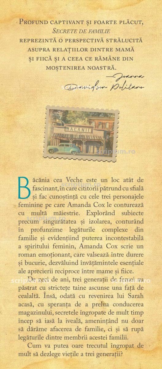 „Cu o intuitie pregnanta si rezonanta emotionala, Amanda Cox exploreaza legatura complicata dintre mame si fiice si secretele care se strecoara de-a lungul generatiilor. Bacania cea Veche este cadrul a trei povesti impletite, un loc care constituie deopotriva refugiu si mostenire pentru femeile ale caror vieti, iubiri si suferinte se desfasoara intre zidurile sale. Luminos si liric, Secrete de familie este o poveste de cea mai buna calitate.“