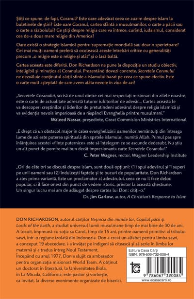 Cei mai mulţi oameni preferă să ocolească aceste întrebări critice cu generalităţi precum „o religie este o religie şi atât” şi o lasă baltă. Cartea aceasta este diferită. Don Richardson ne pune la dispoziţie un studiu obiectiv, inteligibil şi minuţios al Coranului. Prezentând dovezi concrete, Secretele Coranului ne dezvăluie conţinutul cărţii sfinte a islamului bazat pe ceea ce spune efectiv. Este o carte mult așteptată de care avem atâta nevoie în ziua de azi!