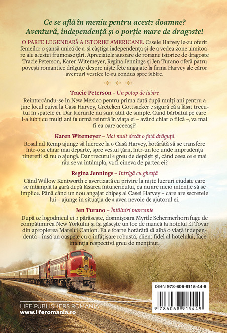 O PARTE LEGENDARA A ISTORIEI AMERICANE. Casele Harvey le-au oferit femeilor o sansa unica de a-si castiga independenta si de a vedea zone uimitoare ale acestei frumoase tari. Apreciatele autoare de romane istorice de dragoste Tracie Peterson, Karen Witemeyer, Regina Jennings si Jen Turano ofera patru povesti romantice dragute despre niste fete angajate la firma Harvey ale caror aventuri vestice le-au condus spre iubire.