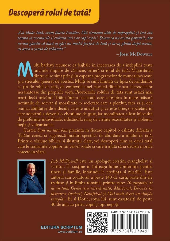 Cartea „Sunt un tata bun?” fiecare capitol se concentreaza pe cate o calitate diferita a Tatalui ceresc si sugereaza moduri specifice de abordare a rolului de tata. Printr-o viziune biblica si ilustratii clare, vei descoperi cum sa devii tatal care le transmite copiilor sai valori solide si care ii ajuta sa ia decizii morale corecte in viata.