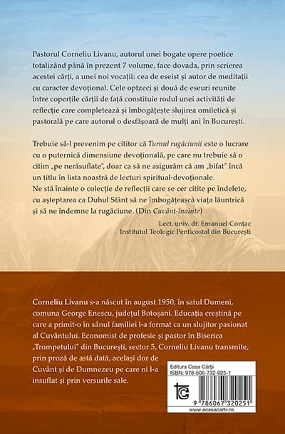 Pastorul Corneliu Livanu, autorul unei bogate opere poetice totalizând până în prezent 7 volume, face dovada, prin scrierea acestei cărți, a unei noi vocații: cea de eseist și autor de meditații cu caracter devoțional. Cele optzeci și două de eseuri reunite între coperțile cărții de față constituie rodul unei activități de reflecție care completează și îmbogățește slujirea omiletică și pastorală pe care autorul o desfășoară de mulți ani în București. Trebuie să-l prevenim pe cititor că Turnul rugăciunii este o lucrare cu o puternică dimensiune devoțională, pe care nu trebuie să o citim „pe nerăsuflate”, doar ca să ne asigurăm că am „bifat” încă un titlu în lista noastră de lecturi spiritual-devoționale. Ne stă înainte o colecție de reflecții care se cer citite pe îndelete, cu așteptarea ca Duhul Sfânt să ne îmbogățească viața lăuntrică și să ne îndemne la rugăciune.