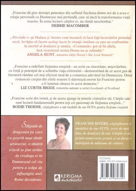 FRANCINE RIVERS, castigatoare a medaliei de aur ECPA, scrie de mai bine de douazeci de ani. Cartile ei au primit numeroase premii si au facut-o indragita de milioane de cititori.