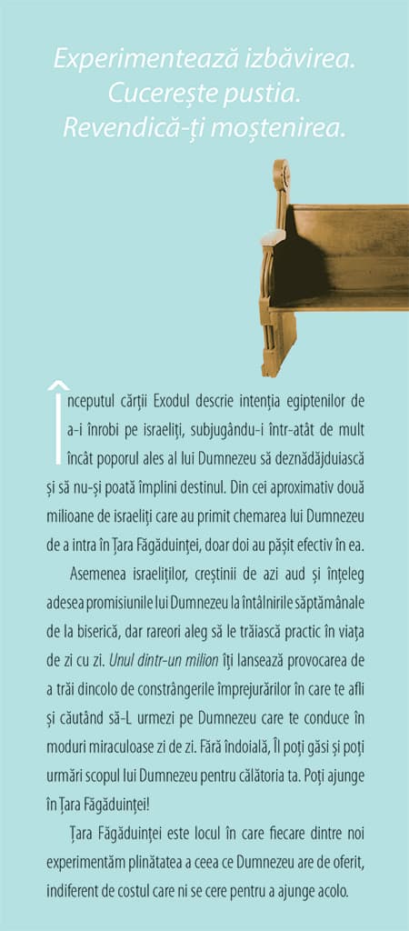 Aproximativ doua milioane de pelerini ai Israelului antic au fost eliberati de sclavia din Egipt, dupa care au ratacit in pustiu timp de o generatie intreaga. Doar doi au ajuns in siguranta in Tara Fagaduintei, ceea ce reprezinta unul dintr-un milion care a fost suficient de curajos pentru a se increde in promisiunea lui Dumnezeu si a merge cu El pana la capat, indiferent unde s-ar afla, indiferent cat l-ar costa.
