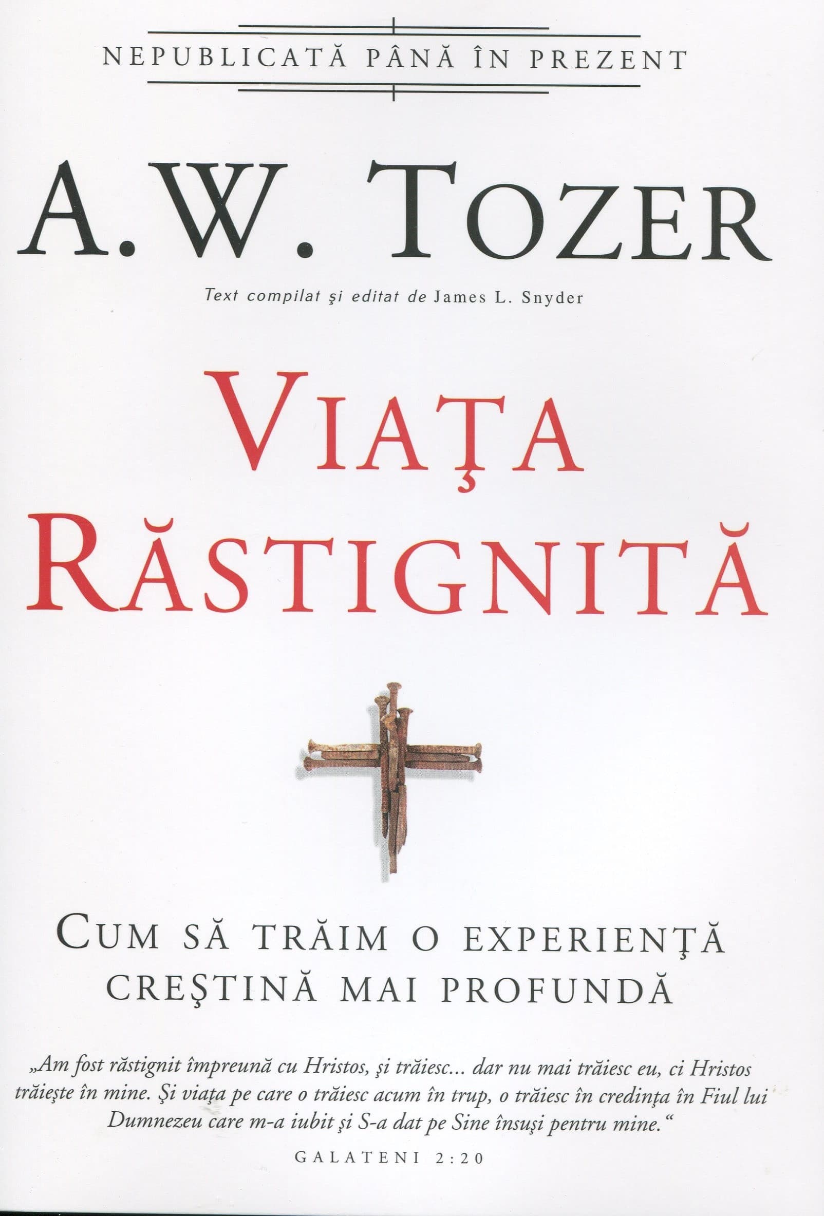 In Epistola sa catre galateni, apostolul Pavel declara ca a fost ‘rastignit impreuna cu Hristos.’ Dar ce inseamna aceasta? Este o afirmatie pe care poate si ar trebui sa o faca orice credincios? Viata rastignita constituie o examinare cuprinzatoare a acestor intrebari, carora li se raspunde cu gandirea biblica profunda pentru care Tozer era respectat. Lui ii placea sa spuna: ‘Dumnezeu da dovada de ingeniozitate in croirea de cruci pentru cei care Il urmeaza.’ In centrul cartii de fata veti gasi chemarea de a-L urma pe Hristos la cruce si de a fi inviati la o viata noua — o chemare la trairea unei vieti rastignite.